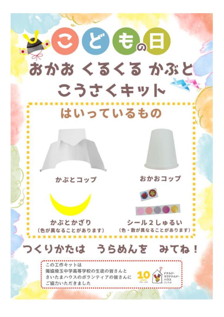 「ドナルド・マクドナルド・ハウス さいたま」支援活動の一環として、昨年末の「クリスマスキット」に続いて、埼玉県立小児医療センターに入院している子どもたちに配られる「こどもの日キット」制作を、インターアクト同好会+有志生徒たちでお手伝いしました。